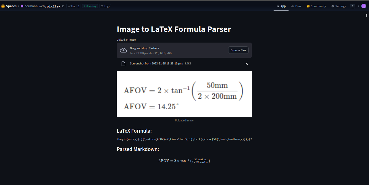 I've implemented and deployed a Streamlit application designed for writing a LaTeX formula from an image containing that formula. The application is hosted on Hugging Face Spaces and github so users can upload images freely and copy LaTeX formulas.